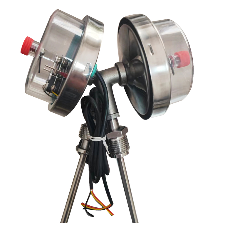 WSSX-411電接點雙金屬溫度計把兩種線膨脹系數不同的金屬組合在一起,一端固定,當溫度變化時,兩種金屬熱膨脹不同,帶動指針偏轉以指示溫度,這就是雙金屬片溫度計。電接點雙金屬溫度計是利用溫度變化時帶動觸點變化,當其與上下限觸點接觸或斷開的同時,使電路中的繼電器動作,從而自動控制及報警。測溫范圍為-80~500C,它適用于工業(yè)上精度要求不高時的溫度測量。雙金屬片作為一種感溫元件也可用于溫度自動控制。