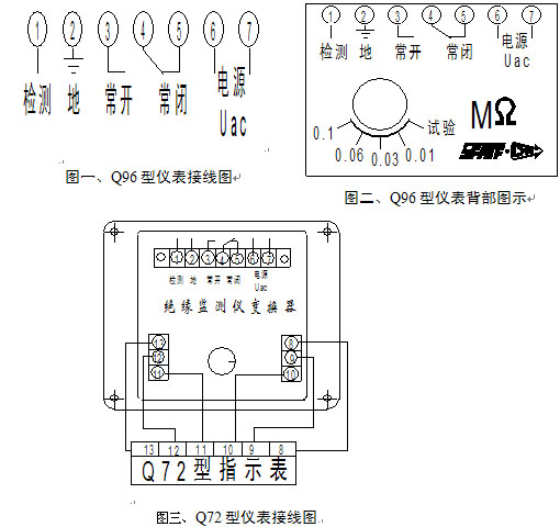 概述 | 主要參數(shù)和技術(shù)指標(biāo) ● 儀表指示偏轉(zhuǎn)角:Q96-MΩA、Q72-MΩA,90°Q96-ZMΩA、Q72-ZMΩA, 240° ● 使用環(huán)境溫度范圍:-25℃~+55℃ ● 耐振動:頻率1~100Hz,加速度≤10m/s2 ● 絕緣強度:線路對外殼2000Vac,1min ● 外磁場強度:≤400A/m ● 儀表準(zhǔn)確度等級:⑩級(基準(zhǔn)值為指示值,按GB/T7676-1998中相關(guān)要求) ● 工作電源容差:100Vac(或220Vac)±15% ● 儀表消耗功率:不大于5VA ● 輸出觸點容量:阻性,28V,5A;220V,1A ● 報警設(shè)置及容差:10kΩ±2kΩ;30kΩ±3kΩ 60kΩ±3kΩ;100kΩ±5kΩ ● 儀表重量:Q96-ZMΩA、Q72-ZMΩA, 1.1kg Q96-MΩA、Q72-MΩA, 0.9kg |